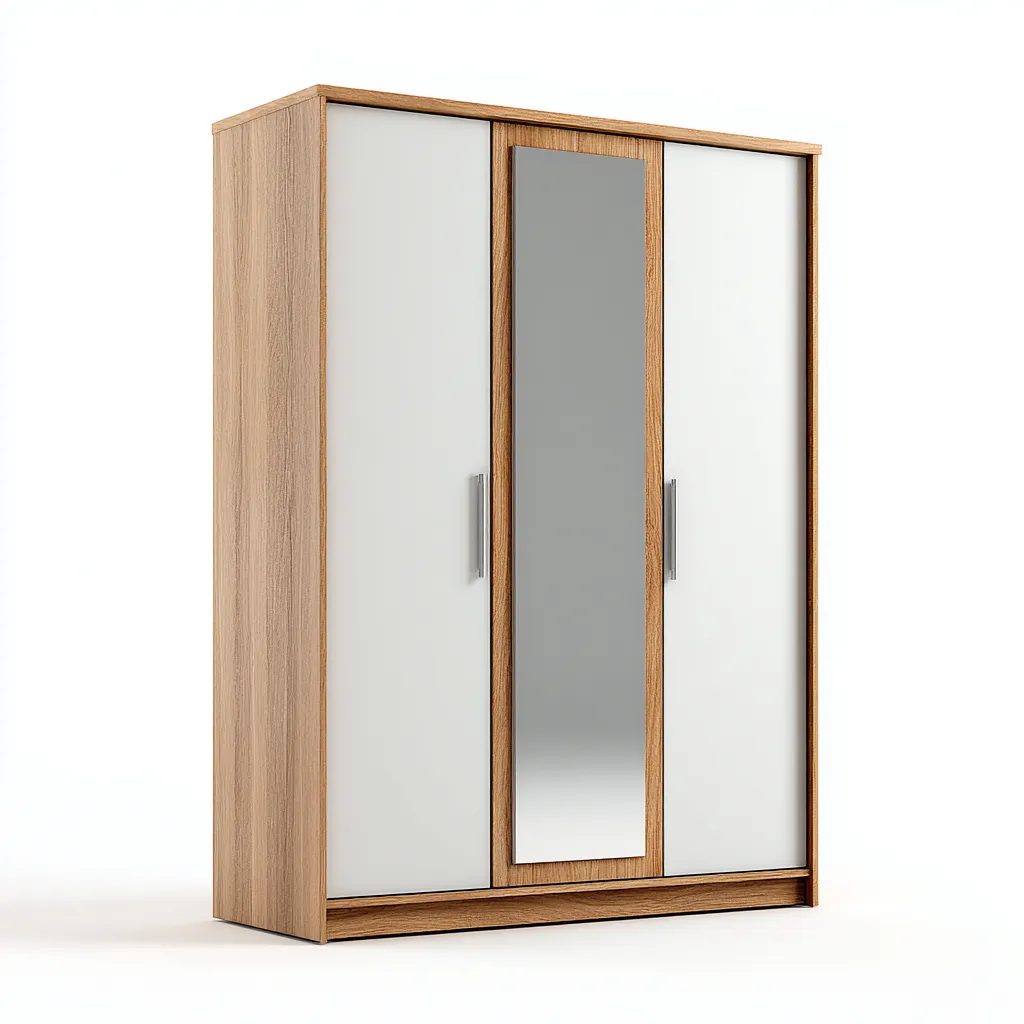 Armario diseñado para el almacenamiento organizado de ropa y accesorios en dormitorios o espacios interiores. El diseño con puertas correderas optimiza el espacio disponible y el espejo central aporta funcionalidad adicional y sensación de amplitud visual.