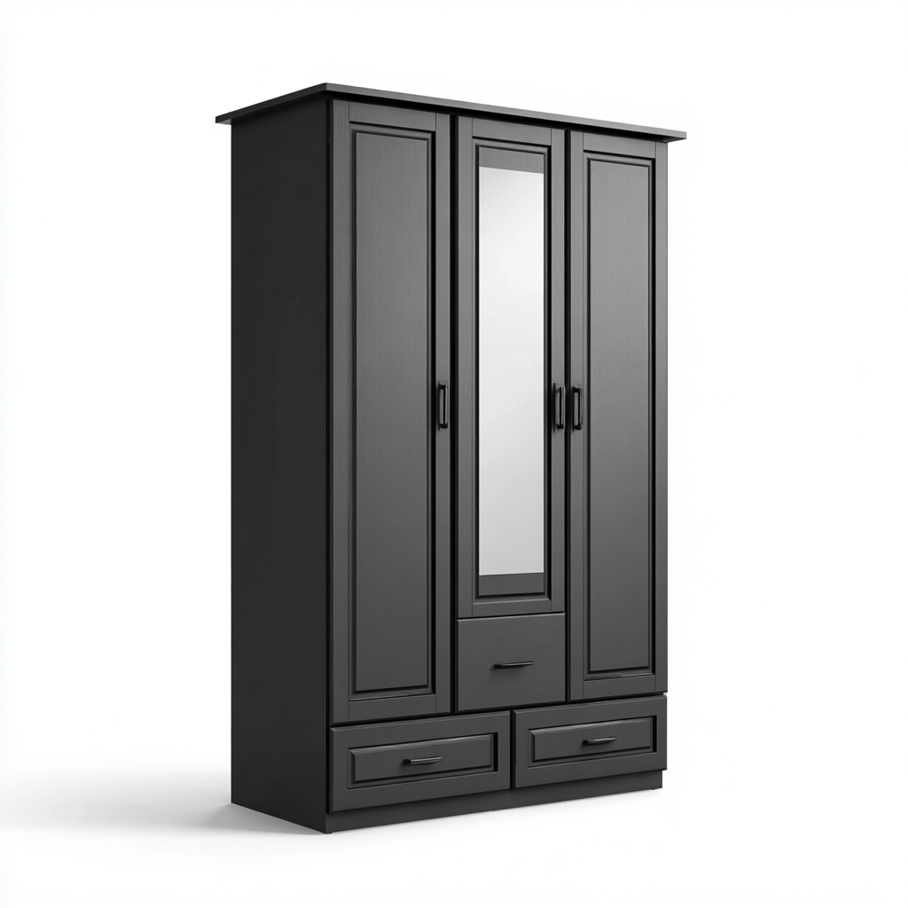 La estructura está fabricada en madera y paneles resistentes con acabado en color negro. La puerta central incorpora un espejo integrado que aporta funcionalidad adicional y una sensación visual de amplitud.