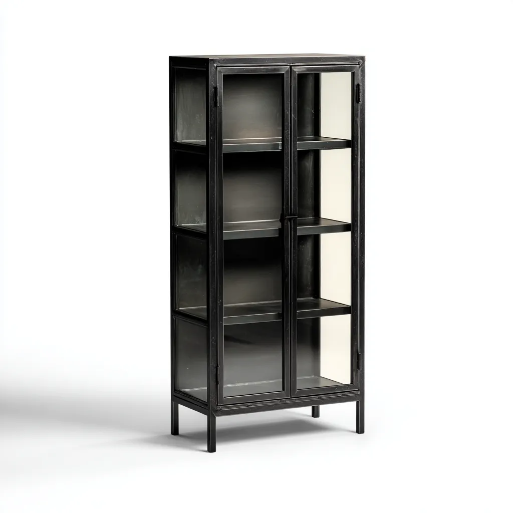 Vitrina de estilo industrial diseñada para espacios interiores como el salón o la entrada. Su estructura vertical permite exhibir objetos decorativos y mantener un espacio organizado con una estética sobria y moderna.