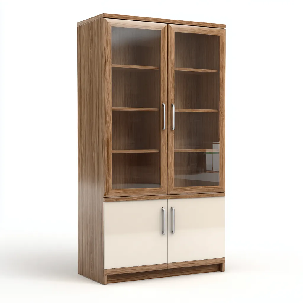 Estructura fabricada en madera con acabado en tono natural. La parte superior incorpora puertas de cristal transparente que facilitan la visualización del interior, mientras que la parte inferior presenta puertas lisas en color beige para un aspecto uniforme y limpio.