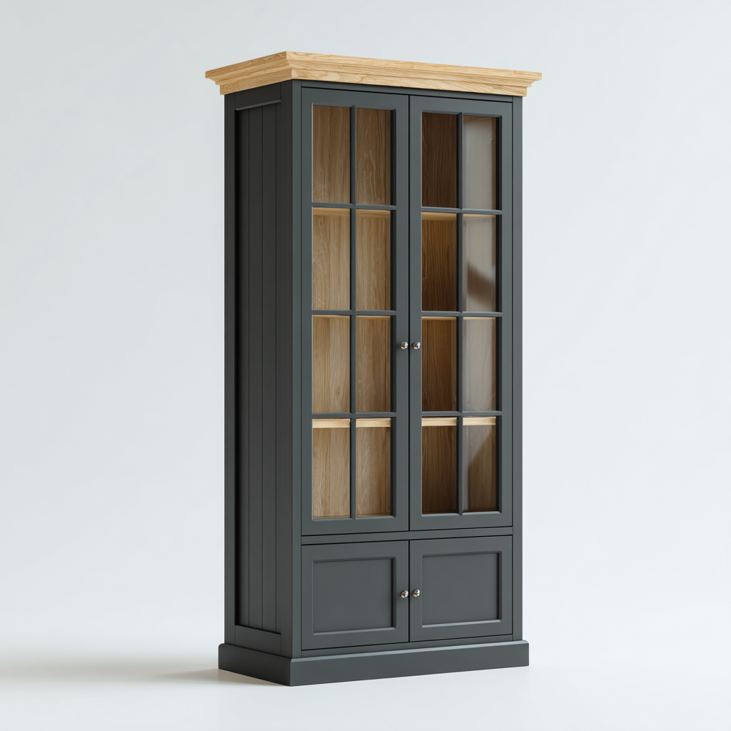 Estructura fabricada en madera con acabado en color gris. La parte superior incorpora puertas de cristal con marcos definidos que facilitan la visualización del interior, mientras que la parte inferior cuenta con puertas de madera maciza. La tapa superior presenta un acabado en madera natural que aporta contraste visual.