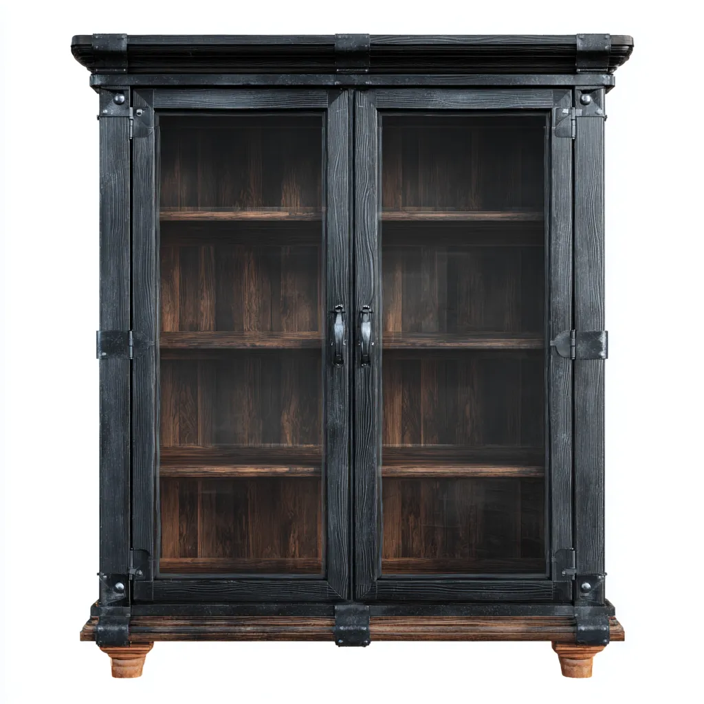 Estructura principal de madera con acabado en tonos negro y marrón, combinada con paneles frontales de cristal transparente. Los herrajes visibles refuerzan el estilo industrial y la solidez del conjunto.
