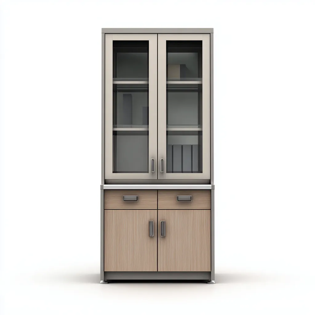 La estructura está fabricada en madera y paneles resistentes. Las puertas superiores incorporan vidrio transparente para facilitar la visualización del interior. El acabado en gris y madera aporta una estética moderna y fácil de integrar en diferentes ambientes.