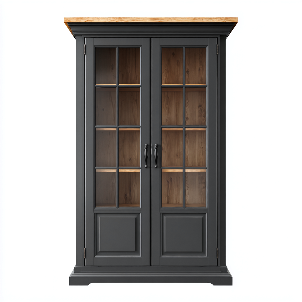Esta vitrina presenta un diseño clásico y bien proporcionado, ideal para el salón o el comedor. Sus puertas acristaladas permiten mostrar objetos de forma ordenada, mientras que el interior ofrece un espacio práctico para el almacenamiento.
